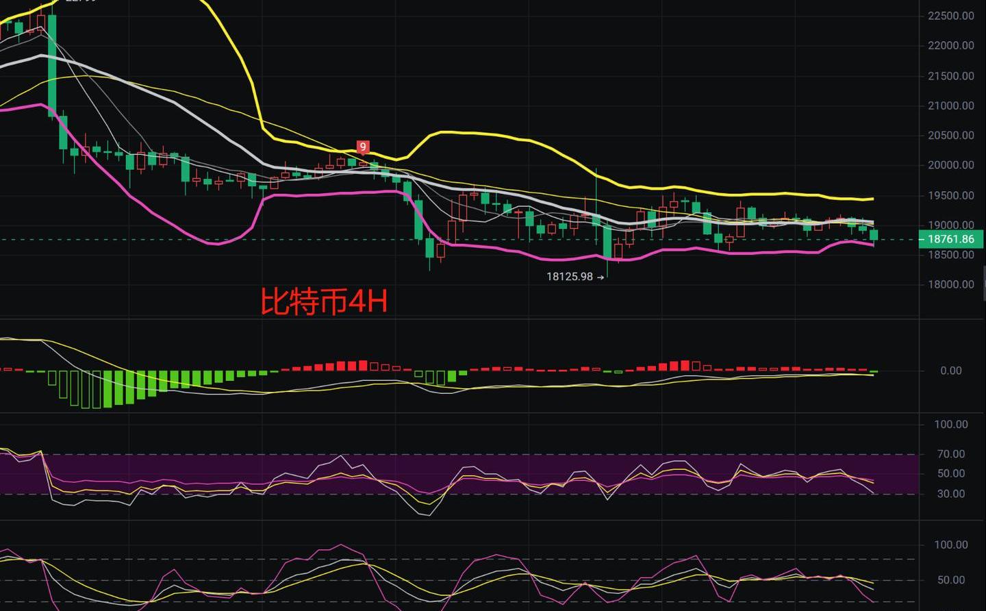 四小时级别来看布林带口持续平缓运行,行情从中轨三连阴后来到了下轨,MACD快慢线粘合成的直线还在延续,萎靡的能量柱由红转绿,RSI和KDJ三线向下发散,有到达超卖区间的趋势,结合小时图来看短期可以吃一波反弹,18600附近多,激进者现价18761也可以多。