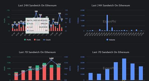 MEV收入:MEV收入除了gas费用的收入以外,还有三明治攻击等方式的收入,据EigenPhi的数据,过去7天三明治攻击的Volume都在100M以上,最高Volume接近400M,MEV的收入成为验证者的重要收入组成之一。