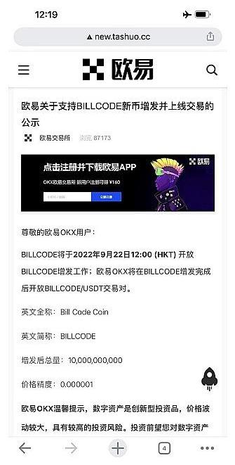 欧易OKx关于支持BILLCODE新币增发并上线交易的公示于2022年9月22日12:00(HKT)正式在欧易交易所快报公示告知: