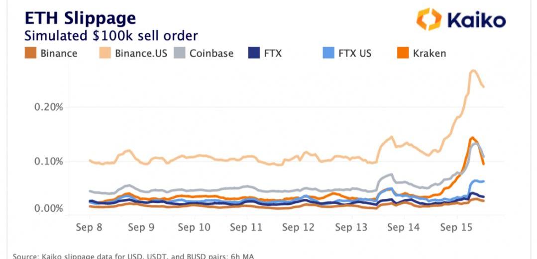 市场深度下降和点差增加的结合导致卖出订单的滑点显着增加,Binance.US的滑点几乎增加了两倍,Kraken的滑点增加了两倍多。Coinbase的滑点几乎增加了两倍,从0.05%跃升至0.135%。