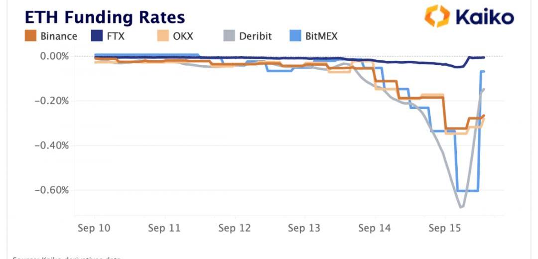 在合并前的24小时内,所有交易所的资金利率都跌至历史低点。通常融资利率接近0的FTX降至-0.0457%。