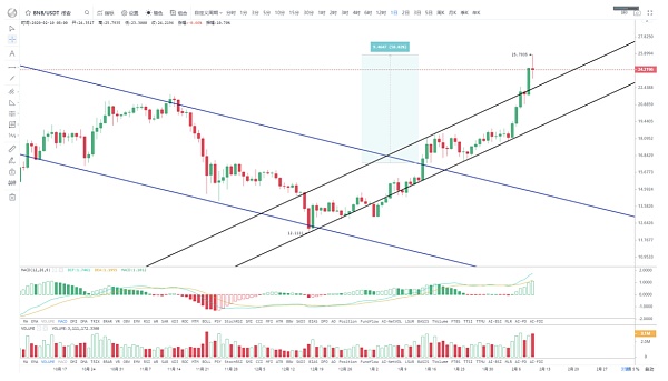 BNB自周线突破后连续4周收阳,自突破点到目前涨幅接近60%,整体走势比较强势,成交量也维持较好,走势健康,后市依然有向上的空间。