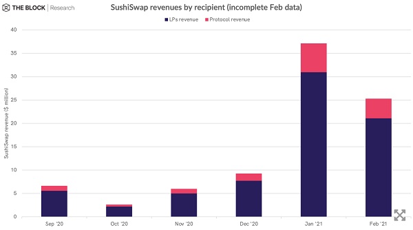 The Block对去中心化金融市场上的头部协议收入状况进行了分析,总体而言,许多DeFi协议都成功获得了可观收入。不过,虽然DeFi行业出现了流动性挖矿等一系列新举措,但大部分收入仍然流向协议供应方(尽管这一趋势目前已经所有改变)。另外值得注意的是,除了Balancer之外,所有DeFi协议在2021年的前两个月都创下月度收入记录。