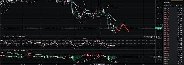 4小时级别下方击穿下轨支撑有所反弹,目前站上1445上方,接下来可着重关注是否能够在此点位站稳,并依托此点位蓄势反弹,技术指标中,布林通道空头排列向下,低点下移,但高点依旧维持不变,下方留下较长下影线,由此可见追空交易量并不多,综合前期走势做参考,币价有在探下方低点蓄势吸筹趋势中,后市可回踩低多看一波反弹。目前小时级别空头有缩量迹象。kdj超卖区运行中。有拐头迹象。短线可看一波反弹修复。