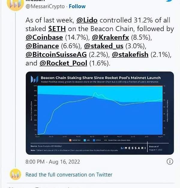 也就是说,批评者说权益证明将使以太坊更加集中和不那么安全,并指出少数持有质押以太币的实体的主导地位。正如数据公司Messari指出的那样,LidoFinance控制着Beacon链上所有质押的ETH的31.2%,而Coinbase控制着14.7%和Kraken8.5%。