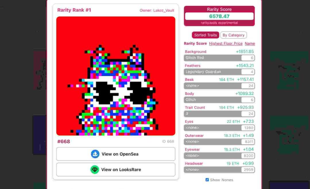 NFT的稀有性对收藏者来说非常重要,市场上有多种方法跟工具可用于确定单个NFT的整体稀有度,其中一些包括Rarity.Tools、RaritySniper、Traitsniper和RaritySniffer,每个都可以提供数千个NFT藏品的大量稀有度和价格数据。例如下图为用Rarity.tools追踪最稀有MoonbirdNFT的数据。