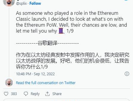 该公告意味着大多数以太坊矿工可能会选择切换到以太坊PoW。ETC的一个潜在的负面结果将是有利于以太坊PoW链的矿工流出。这两个区块链网络将争夺更喜欢PoW网络而不是PoS的项目。