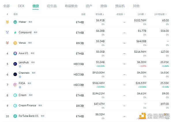锁仓量排名前十的借贷平台 排名来源:DeFibox