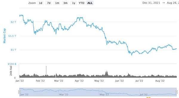 据加密货币价格追踪网站Coinmarketcap统计,年初至今,主流加密货币均遭遇大规模下跌。除了稳定币,市值排名较前的货币跌幅多位于40%-60%区间。加密货币整体市值目前接近1.04万亿美元,相较年初跌去近50%。