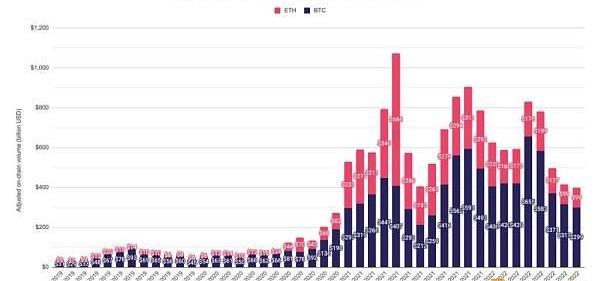 比特币和以太坊链上交易量上,经调整后的总链上交易量下降4.2%至3980亿美元,其中比特币链上交易量下降5.5%,而以太坊基本持平。