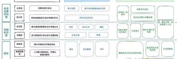 大象放入冰箱需要几个步骤呢?三个步骤而已。第一步打开冰箱,第二步放入大象,第三步关上冰箱。从一个使用者的角度,去应用SBT也只需要三步,相当简单。第一步使用SBT相关应用,第二步mintSBT的token,第三步存到自己的钱包里。这三个最简单的用户行为包含了SBT最重要的三个步骤:1.信息收集和处理2.传输和存储?3.绑定。将前文OSI七个层级分别一一对应到用户使用SBT的三个步骤中,再一次地观察现有的行业生态会得到下图: