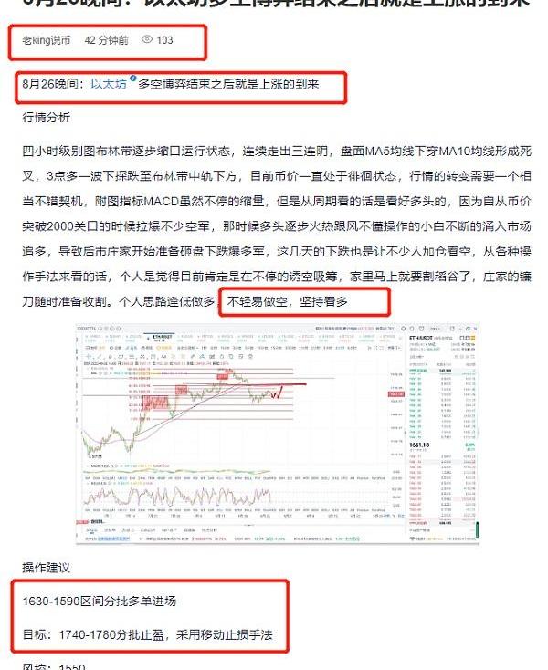 哈喽各位币友晚上好,今天下午发了一篇文章坚持看多,1630-1590区间分批进多,晚间7点到达了我们入场点位,刚刚币价一波反弹突破1704附近,目前我们的操作建议已经吃了74美刀,恭喜跟上的老铁,注意分批止盈,移动止损,以防获利回吐,老king带你穿越牛熊,教你如何逃顶,抄底,如果近期操作不如意,一直处于亏损状态,不如换个老师换个环境,也许就是你的这一次改变,让你有了意想不到的收获,喜欢老king的点点关注