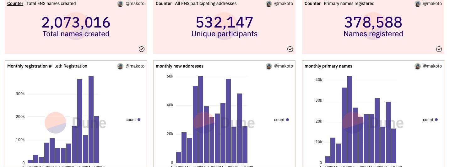 各种三位数、四位数以及Emoji表情的ENS域名备受追捧,成交价格持续攀升;多名巨鲸批量创建和扫货ENS域名,并在个人使用的域名中附上网站链接,做起了域名售卖生意。数据显示,7月新注册ENS域名378442个,超过此前5月创下的最高记录,创历史新高;截至目前,ENS域名创建总量已突破200万。
