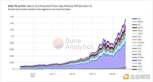 还可以发现稳定币池子对Bancor的无常损失保险费用有重大贡献。任一方向的市场趋势越强,任何稳定币/BNT对的价格偏差就越大。