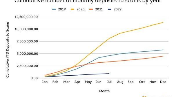 同样重要的是要清晰收入通常是由大型异常值所驱动的,例如PlusToken,在2019年从受害者当中取超过20亿美元的资产;还有Finiko在2021年取超过15亿美元的资产。2022年到目前为止,还没有发现任何金额接近二者的水平。