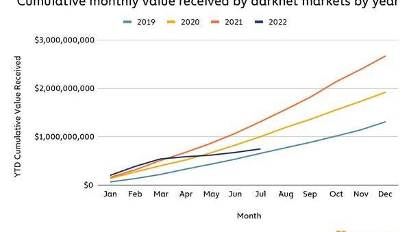 2022年暗网市场收入也明显下降,同2021年同期相比降低43%。与不同的是,暗网市场并非全年都是如此,2022年暗网市场4月份高于2021年4月份的收入,此后其增长率急剧下跌。这与4月5日HydraMarketplace的关闭和被制裁有关。该市场长期以来都是主要的暗网市场,不仅充当销售的中心平台,还充当了黑客工具、被盗数据和服务的销售平台。