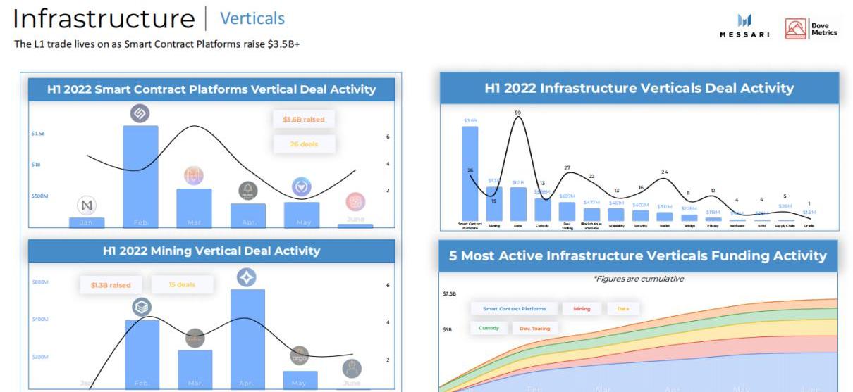 基础设施领域上半年发生投融资事件252起,共筹集了97亿美元的资金,规模仅次于CeFi。其资金总量环比增长131%、同比增长246%,披露的投融资事件环比增长129%、同比增长84%。基础设施获投项目从融资轮次的阶段来看与CeFi颇为相似,早期148起、A轮43起、后期61起,且63%的项目总金额超过500万美元、43%的项目总金额超过1000万美元。其中,智能合约平台融资总量为36亿美元,是资本押注力度最大的项目类型,在所有赛道的垂直领域中位列第一,其他热门的项目还有数据、托管、挖矿等。
