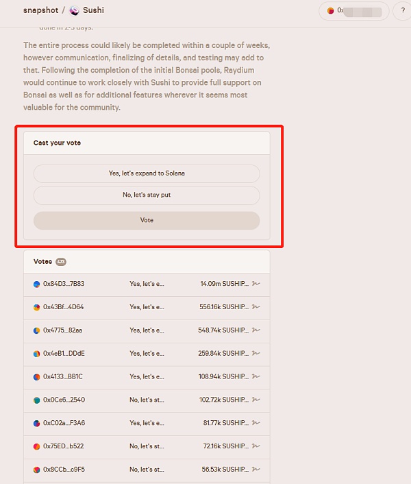 这是一个关于sushi是否要扩展到solana链上的提案,操作演示上,我们选择“支持”