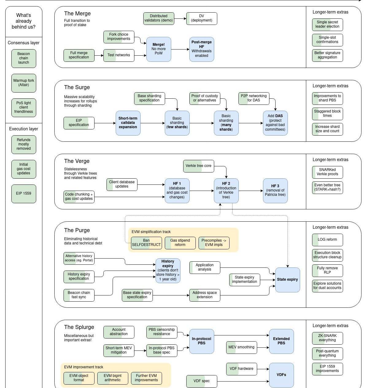 以太坊路线图的主要目标是最小化信任假设,并通过实现本地解决方案提供协议内可扩展性。以太坊的基础层是整个去中心化应用生态系统的宿主,有望从根本上改变我们在数字时代对身份、存储、搜索、声誉和隐私的思考方式。将以太坊升级为基础层也提升了这个应用层,通过提供高度安全、健壮的基础设施来在全球范围内扩展这些用例,使用户和开发人员受益。以太坊的愿景是全球范围内的数字未来。它对可信中立性原则以及以太坊的网络效应、去中心化和安全性的坚持,牢牢地巩固了它在未来去中心化网络中的角色。合并是守护以太坊实现这一愿景的第一步。