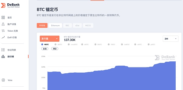 WBTC 全称 Wrapped Bitcoin,是 BTC 基于以太坊的一种锚定币,2019 年 1 月由 Kyber Network、BigGo 共同发起,可以和 BTC 1:1 兑换。通俗地说,就是 ERC-20 版本的 BTC。在debank 上面,WBTC的数量占了比特币锚定币数量超过70%,超十三万个。