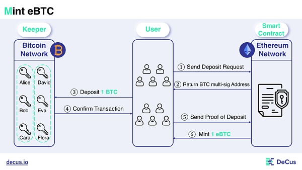 eBTC是基于去中心化的跨链协议DeCus 开发的创新算法稳定币,整个系统运行效果是这样的,想要创建eBTC的用户首先向以太坊网络上的智能合约提交请求,然后获取指定的Keeper group的BTC多签地址。在向该多重签名地址存入一定数量的BTC并提交存款证明后,相应数量的eBTC将被发送到用户的ETH地址。