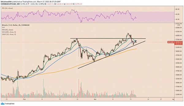 比特币市场继续保持在其关键的技术支持层面,从最近创下的创纪录的61,788美元(Coinbase的数据)开始大幅修正。