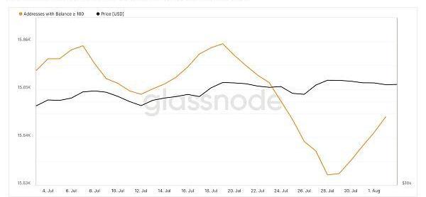 这是因为Glassnode记录了100BTC和10,000BTC地址的巨大增长。