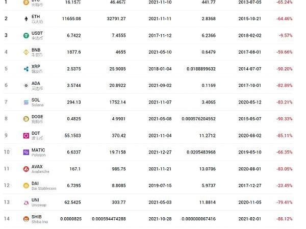 上图截取了加密市值前十五名的加密币种的数据。其中ATH跌幅一项可以清晰地看出,前十五名市值的非稳定币币种,跌幅都在60%以上,跌幅最多的XRP、Doge跌幅还有90%以上。考虑到加密市值整体跌幅在62%,而且稳定币的市值占比已经达到了13%,他们的跌幅是0,这也说明其他非稳定币的跌幅超过了70%,市值大的两个跌幅在65%左右,剩下的Altcoins平均跌幅就达到了83.8%。所以从3万亿美元高点一路扛下来的投资者,手里没点跌幅90%以上的币确实是不太正常的