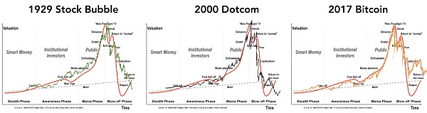 前面说过,没有一模一样的两个泡沫,但是所有的泡沫都有着类似的发展轨迹,这是1929年美国股市泡沫的情况,这是2000年互联网泡沫的情况,这是比特币第三轮周期的泡沫情况。