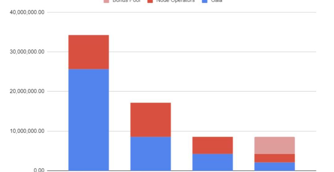 新增的GALA代币,一部分会分发给创始人节点,另一部分则分发给GalaGames平台,而两者的比例可以由创始人节点投票改变。