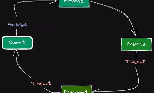 Tendermint使用拜占庭共识模型,并实现即时终结。BFT过程在提议块的最终提交阶段之前经历了三个阶段。这三个阶段是: