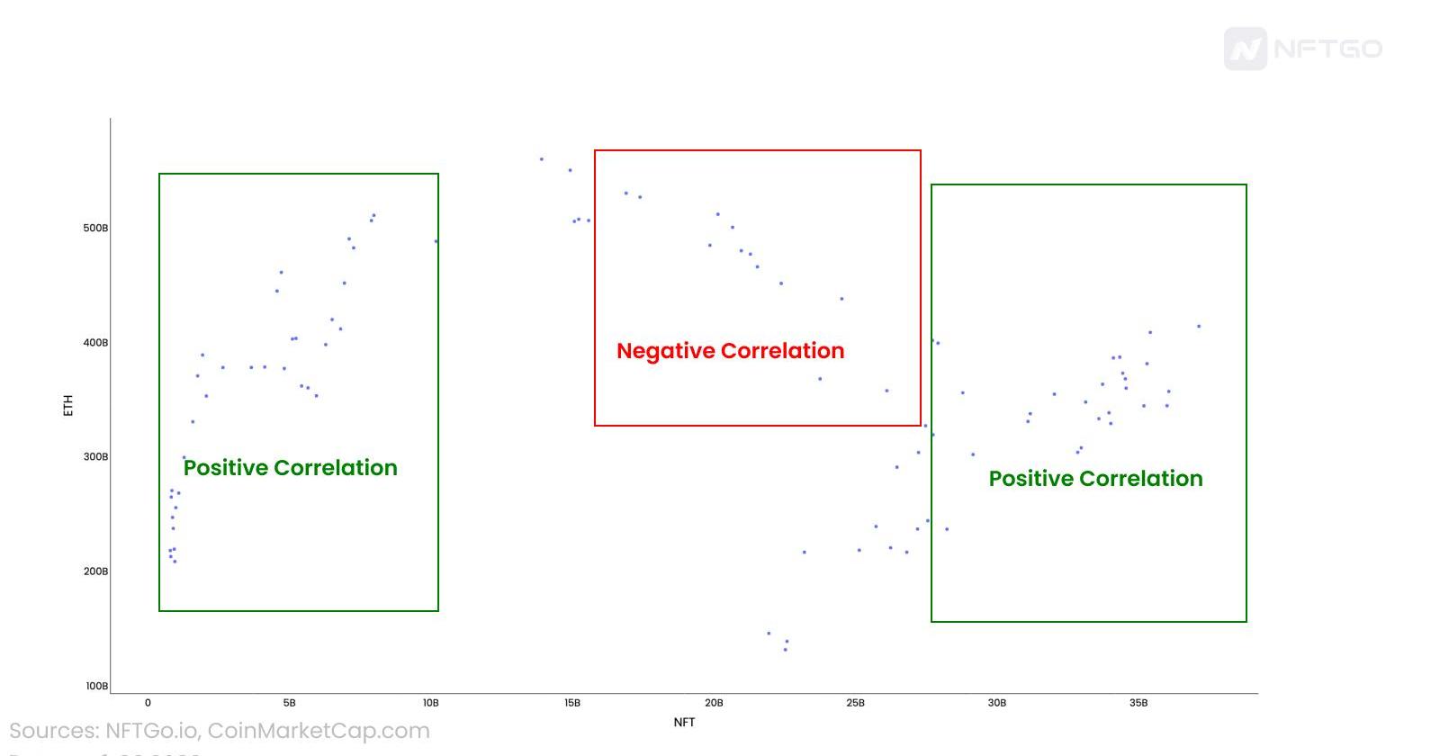 下面的图表说明了在过去3个月中NFT和ETH市值之间的相关性。X轴代表NFT的总市值,在其高峰期增长到超过380亿美元,y轴表示同一时期3个月内的以太坊市值。