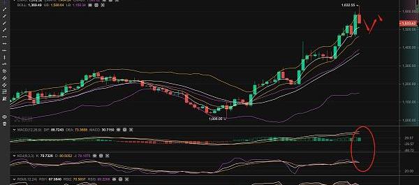 日线方面:布林带开口向上运行,MACD绿色量柱放量,KDJ和RSI均有拐头向下的趋势,行情连续5连阳,从下轨附近开始反弹,连续突破上轨及60日均线压制,从盘面上看,行情连续反弹后,有震荡整理的迹象,若行情要更加健康的向上,那么回踩整理将成为必然,周线方面,行情反弹只10日均线附近,承压回落,今天行情能站上1560附近压制,那么将继续反弹。反之则有下行的风险,今天操作上长路建议回踩做多为主,突破上方压制则继续持有,否则空单进场,空单将在实时策略具体给出。