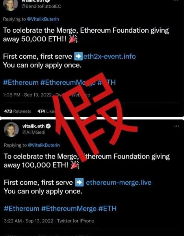 围绕以太坊合并这一热点事件,已经有子在使用加V的推特账户冒充以太坊联合创始人VitalikButerin,宣传虚假的ETH空投,诱导网友访问者的加密钱包,这些地址很可能涉及钓鱼欺诈,需要投资者谨慎识别。